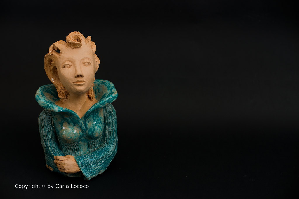 Miss Mary ist eine elegante Lady, die sich wohl draußen so wie drinnen fühlt...vor Frost muss sie aber geschützt werden...! Mit ihrem terrrakottafarbigen Gesicht , türkisen Kostüm und vor allem der souveränen Haltung wirkt sie imponierend....ein Unikat...das in jedem Raum belebend wirkt!