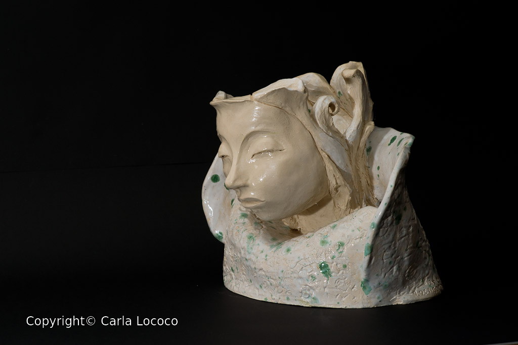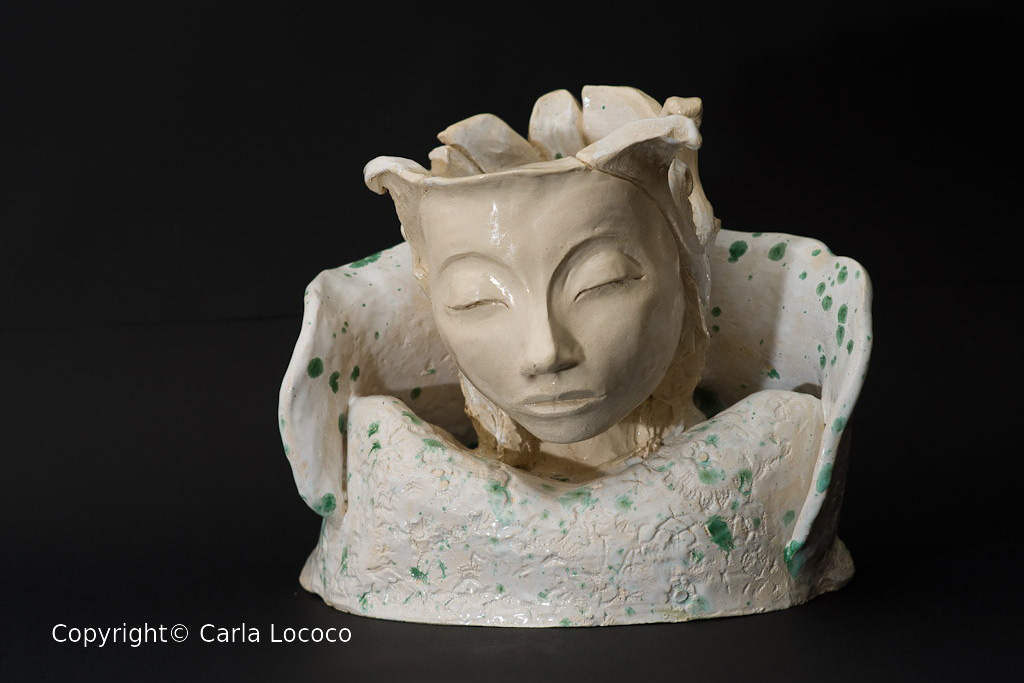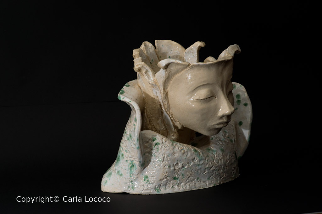 Märchenhafte frei modellierte Gartenskulptur aus weißem Ton gestaltet, delikat glasiert. Wetterfest, sollte aber vor Frost geschützt werden.